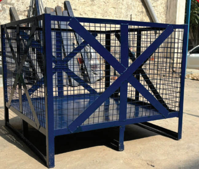 Mobile trolley with mesh sides for transporting items safely inside warehouses. Available in 2, 3, or 4-sided designs with castor wheels.